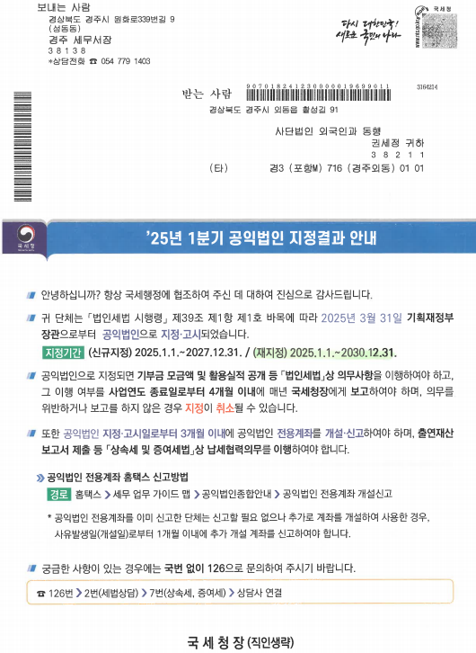 안녕하십니까? 본 법인에서는 2025년 1월 1일부터 2030년 12월 31일까지 지정기부금단체로 재지정 되었습니다. 본 법인으로 기부하신 모든 현금이나 물품은 기부금 영수증을 발급 받으실 수 있습니다. 감사합니다.─ Attachmentsimport-hBshwnZ6ZoP7yOLrHnoh.png261.0 KB